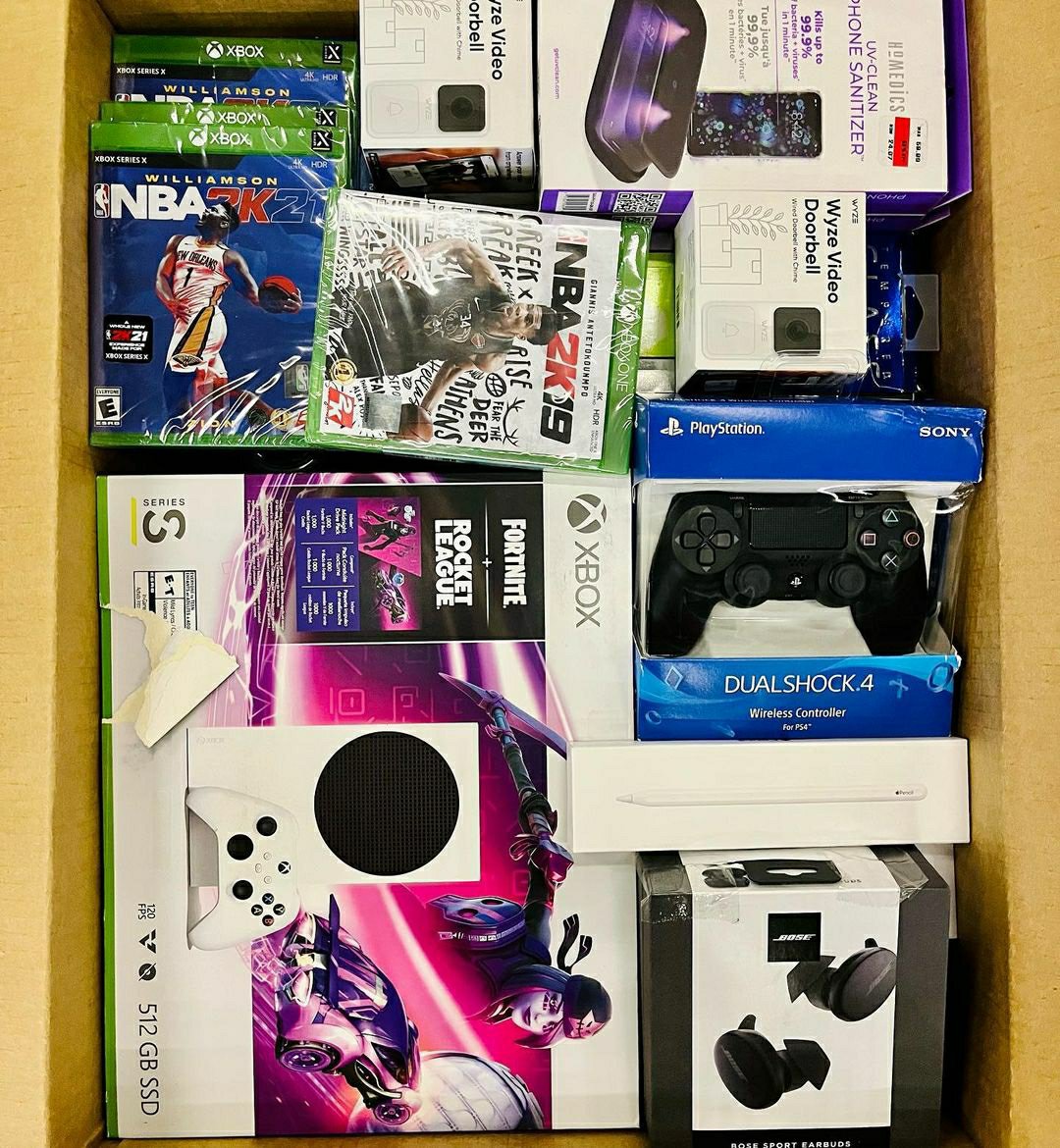 Mixed electronics including apple airpods , bose headphones & speakers, Nintendo switch games & accessories, Xbox games & accessories, PlayStation games and accessories, & more, Buy Premium Mystery Boxes.